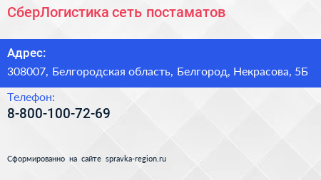 СберЛогистика, сеть постаматов по адресу 308007, Белгородская область, Белгород, Некрасова, 5Б в дальнейшем Организация, размещена в следующих категориях:
