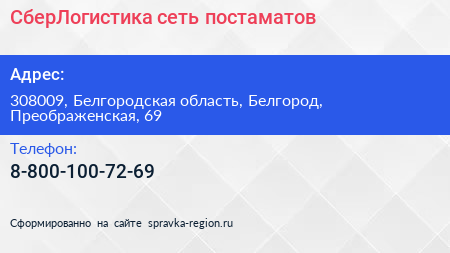 СберЛогистика, сеть постаматов по адресу 308009, Белгородская область, Белгород, Преображенская, 69 в дальнейшем Организация, размещена в следующих категориях: