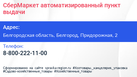 СберМаркет, автоматизированный пункт выдачи по адресу Белгородская область, Белгород, Придорожная, 2 в дальнейшем Организация, размещена в следующих категориях: