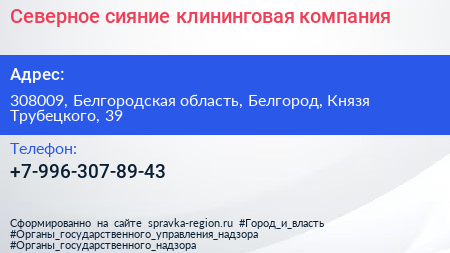Северное сияние, клининговая компания по адресу 308009, Белгородская область, Белгород, Князя Трубецкого, 39 в дальнейшем Организация, размещена в следующих категориях: