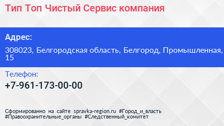 Тип-Топ Чистый Сервис, компания по адресу 308023, Белгородская область, Белгород, Промышленная, 15 в дальнейшем Организация, размещена в следующих категориях: