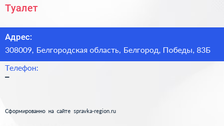 Туалет по адресу 308009, Белгородская область, Белгород, Победы, 83Б в дальнейшем Организация, размещена в следующих категориях:
