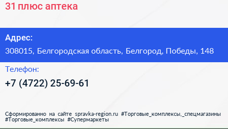 31 плюс, аптека по адресу 308015, Белгородская область, Белгород, Победы, 148 в дальнейшем Организация, размещена в следующих категориях: