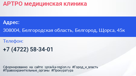 АРТРО, медицинская клиника по адресу 308004, Белгородская область, Белгород, Щорса, 45к в дальнейшем Организация, размещена в следующих категориях: