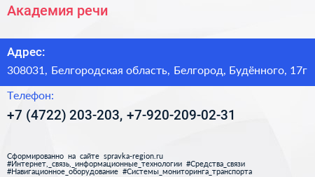 Академия речи по адресу 308031, Белгородская область, Белгород, Будённого, 17г в дальнейшем Организация, размещена в следующих категориях: