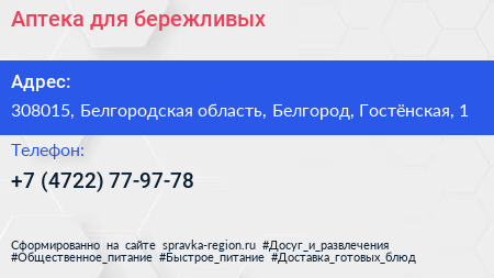 Аптека для бережливых по адресу 308015, Белгородская область, Белгород, Гостёнская, 1 в дальнейшем Организация, размещена в следующих категориях: