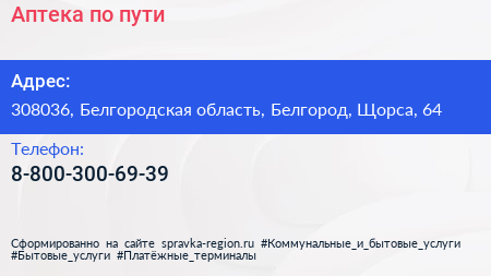 Аптека по пути по адресу 308036, Белгородская область, Белгород, Щорса, 64 в дальнейшем Организация, размещена в следующих категориях: