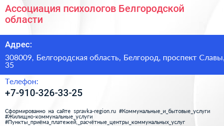Ассоциация психологов Белгородской области по адресу 308009, Белгородская область, Белгород, проспект Славы, 35 в дальнейшем Организация, размещена в следующих категориях: