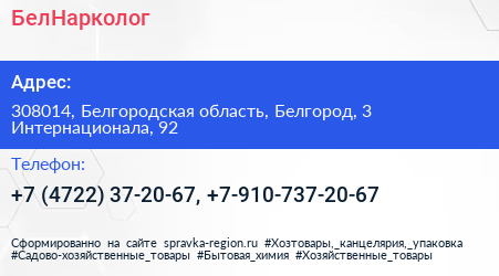БелНарколог по адресу 308014, Белгородская область, Белгород, 3 Интернационала, 92 в дальнейшем Организация, размещена в следующих категориях: