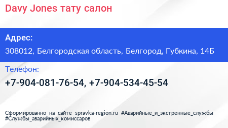 Davy Jones, тату-салон по адресу 308012, Белгородская область, Белгород, Губкина, 14Б в дальнейшем Организация, размещена в следующих категориях:
