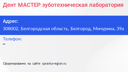 Дент-МАСТЕР, зуботехническая лаборатория по адресу 308002, Белгородская область, Белгород, Мичурина, 39а в дальнейшем Организация, размещена в следующих категориях: