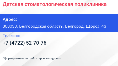Детская стоматологическая поликлиника по адресу 308033, Белгородская область, Белгород, Щорса, 43 в дальнейшем Организация, размещена в следующих категориях: