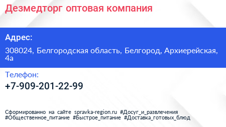 Дезмедторг, оптовая компания по адресу 308024, Белгородская область, Белгород, Архиерейская, 4а в дальнейшем Организация, размещена в следующих категориях: