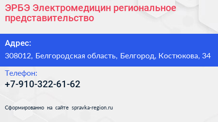 ЭРБЭ Электромедицин, региональное представительство по адресу 308012, Белгородская область, Белгород, Костюкова, 34 в дальнейшем Организация, размещена в следующих категориях: