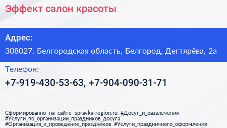 Эффект, салон красоты по адресу 308027, Белгородская область, Белгород, Дегтярёва, 2а в дальнейшем Организация, размещена в следующих категориях: