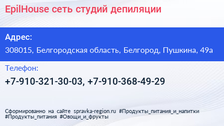 EpilHouse, сеть студий депиляции по адресу 308015, Белгородская область, Белгород, Пушкина, 49а в дальнейшем Организация, размещена в следующих категориях: