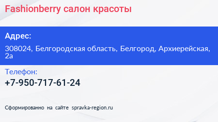 Fashionberry, салон красоты по адресу 308024, Белгородская область, Белгород, Архиерейская, 2а в дальнейшем Организация, размещена в следующих категориях: