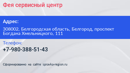 Фея, сервисный центр по адресу 308002, Белгородская область, Белгород, проспект Богдана Хмельницкого, 111 в дальнейшем Организация, размещена в следующих категориях: