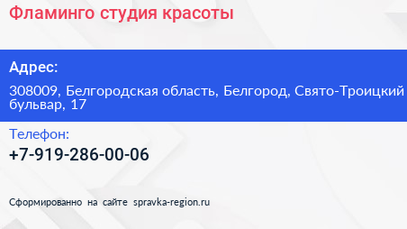 Фламинго, студия красоты по адресу 308009, Белгородская область, Белгород, Свято-Троицкий бульвар, 17 в дальнейшем Организация, размещена в следующих категориях: