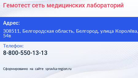 Гемотест, сеть медицинских лабораторий по адресу 308511, Белгородская область, Белгород, улица Королёва, 54в в дальнейшем Организация, размещена в следующих категориях: