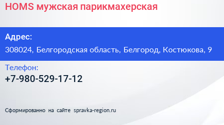 HOMS, мужская парикмахерская по адресу 308024, Белгородская область, Белгород, Костюкова, 9 в дальнейшем Организация, размещена в следующих категориях: