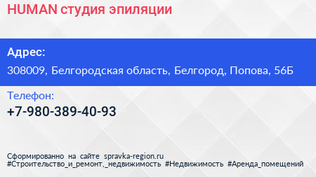 HUMAN, студия эпиляции по адресу 308009, Белгородская область, Белгород, Попова, 56Б в дальнейшем Организация, размещена в следующих категориях: