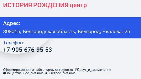 ИСТОРИЯ РОЖДЕНИЯ, центр по адресу 308015, Белгородская область, Белгород, Чкалова, 25 в дальнейшем Организация, размещена в следующих категориях: