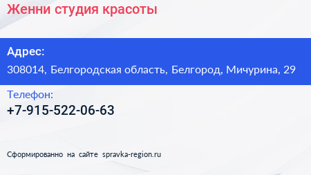 Женни, студия красоты по адресу 308014, Белгородская область, Белгород, Мичурина, 29 в дальнейшем Организация, размещена в следующих категориях: