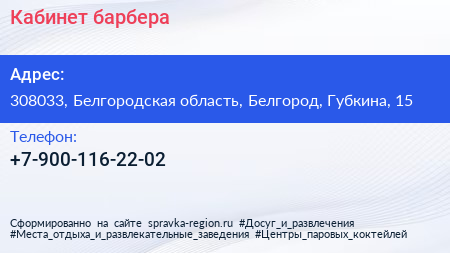 Кабинет барбера по адресу 308033, Белгородская область, Белгород, Губкина, 15 в дальнейшем Организация, размещена в следующих категориях: