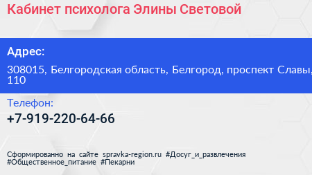 Кабинет психолога Элины Световой по адресу 308015, Белгородская область, Белгород, проспект Славы, 110 в дальнейшем Организация, размещена в следующих категориях: