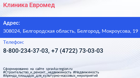 Клиника Евромед по адресу 308024, Белгородская область, Белгород, Мокроусова, 19 в дальнейшем Организация, размещена в следующих категориях: