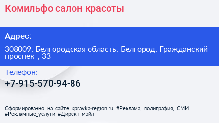 Комильфо, салон красоты по адресу 308009, Белгородская область, Белгород, Гражданский проспект, 33 в дальнейшем Организация, размещена в следующих категориях: