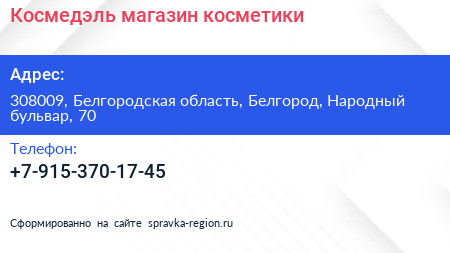 Космедэль, магазин косметики по адресу 308009, Белгородская область, Белгород, Народный бульвар, 70 в дальнейшем Организация, размещена в следующих категориях: