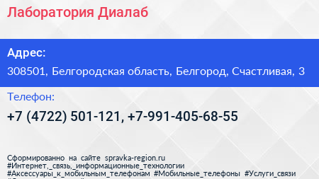 Лаборатория Диалаб по адресу 308501, Белгородская область, Белгород, Счастливая, 3 в дальнейшем Организация, размещена в следующих категориях: