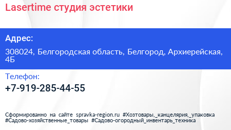 Lasertime, студия эстетики по адресу 308024, Белгородская область, Белгород, Архиерейская, 4Б в дальнейшем Организация, размещена в следующих категориях: