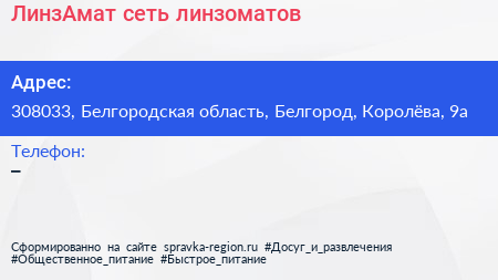 ЛинзАмат, сеть линзоматов по адресу 308033, Белгородская область, Белгород, Королёва, 9а в дальнейшем Организация, размещена в следующих категориях: