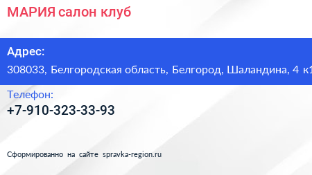 МАРИЯ, салон-клуб по адресу 308033, Белгородская область, Белгород, Шаландина, 4 к1 в дальнейшем Организация, размещена в следующих категориях: