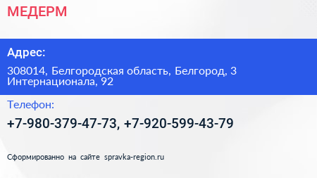 МЕДЕРМ по адресу 308014, Белгородская область, Белгород, 3 Интернационала, 92 в дальнейшем Организация, размещена в следующих категориях: