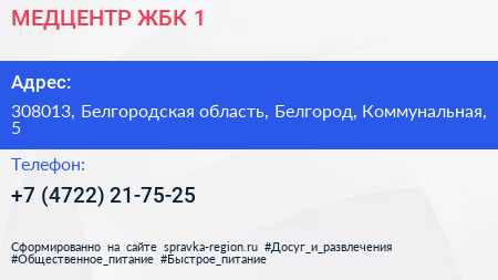 МЕДЦЕНТР ЖБК-1 по адресу 308013, Белгородская область, Белгород, Коммунальная, 5 в дальнейшем Организация, размещена в следующих категориях: