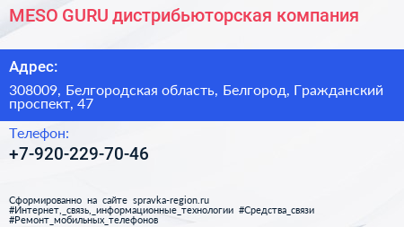 MESO GURU, дистрибьюторская компания по адресу 308009, Белгородская область, Белгород, Гражданский проспект, 47 в дальнейшем Организация, размещена в следующих категориях: