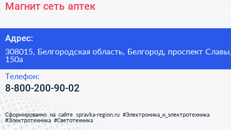 Магнит, сеть аптек по адресу 308015, Белгородская область, Белгород, проспект Славы, 150а в дальнейшем Организация, размещена в следующих категориях: