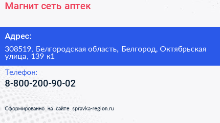 Магнит, сеть аптек по адресу 308519, Белгородская область, Белгород, Октябрьская улица, 139 к1 в дальнейшем Организация, размещена в следующих категориях: