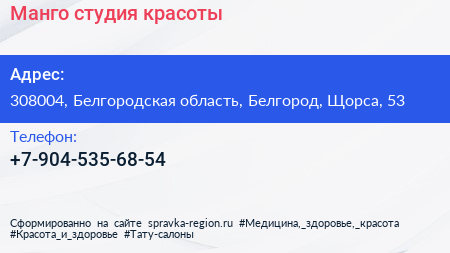 Манго, студия красоты по адресу 308004, Белгородская область, Белгород, Щорса, 53 в дальнейшем Организация, размещена в следующих категориях: