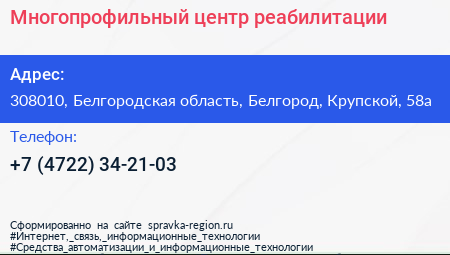 Многопрофильный центр реабилитации по адресу 308010, Белгородская область, Белгород, Крупской, 58а в дальнейшем Организация, размещена в следующих категориях: