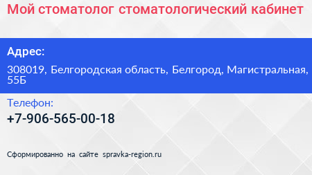 Мой стоматолог, стоматологический кабинет по адресу 308019, Белгородская область, Белгород, Магистральная, 55Б в дальнейшем Организация, размещена в следующих категориях: