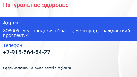 Натуральное здоровье по адресу 308009, Белгородская область, Белгород, Гражданский проспект, 4 в дальнейшем Организация, размещена в следующих категориях: