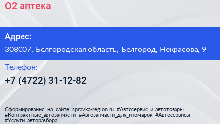 O2, аптека по адресу 308007, Белгородская область, Белгород, Некрасова, 9 в дальнейшем Организация, размещена в следующих категориях: