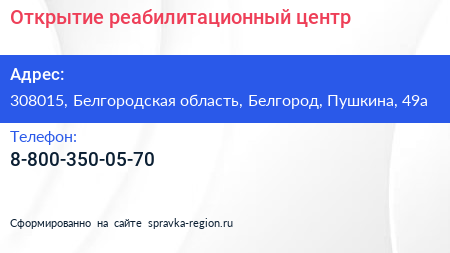 Открытие, реабилитационный центр по адресу 308015, Белгородская область, Белгород, Пушкина, 49а в дальнейшем Организация, размещена в следующих категориях: