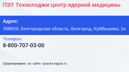 ПЭТ-Технолоджи, центр ядерной медицины по адресу 308010, Белгородская область, Белгород, Куйбышева, 2а в дальнейшем Организация, размещена в следующих категориях: