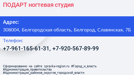 ПОДАРТ, ногтевая студия по адресу 308004, Белгородская область, Белгород, Славянская, 7Б в дальнейшем Организация, размещена в следующих категориях: